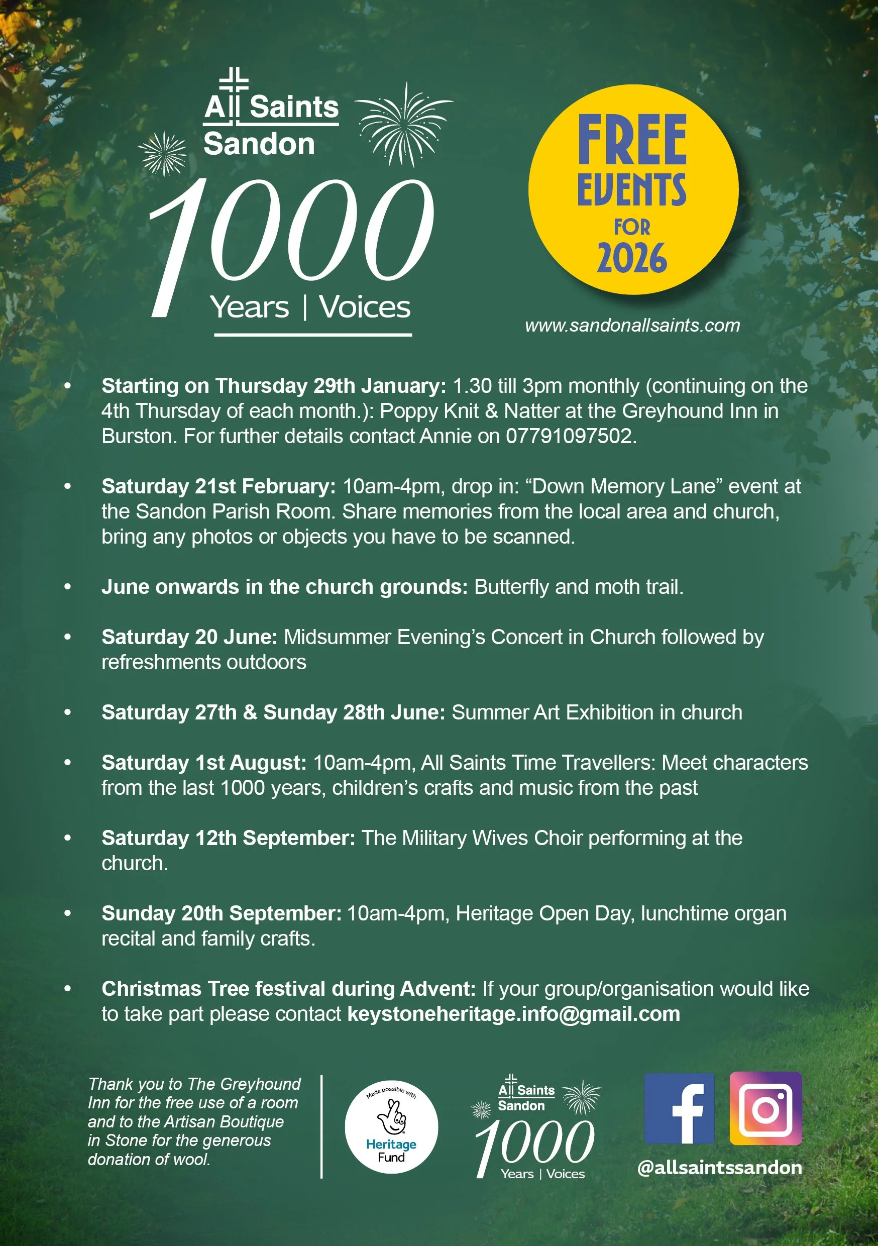 In addition to our website www.sandonallsaints.com we are now active on Facebook and Instagram. Whether you are fan of social media or not we know that it’s another way to tell the world about our beautiful church and our National Lottery Heritage Funded project. If you have an account on these platforms please give us a FOLLOW and LIKE our posts and ask your family and friends to do the same. It really helps to spread the word and it keeps you up to date with our forthcoming events and activities. Next year, we will be celebrating centuries of worship and heritage at Sandon so we will have lots of news to share.