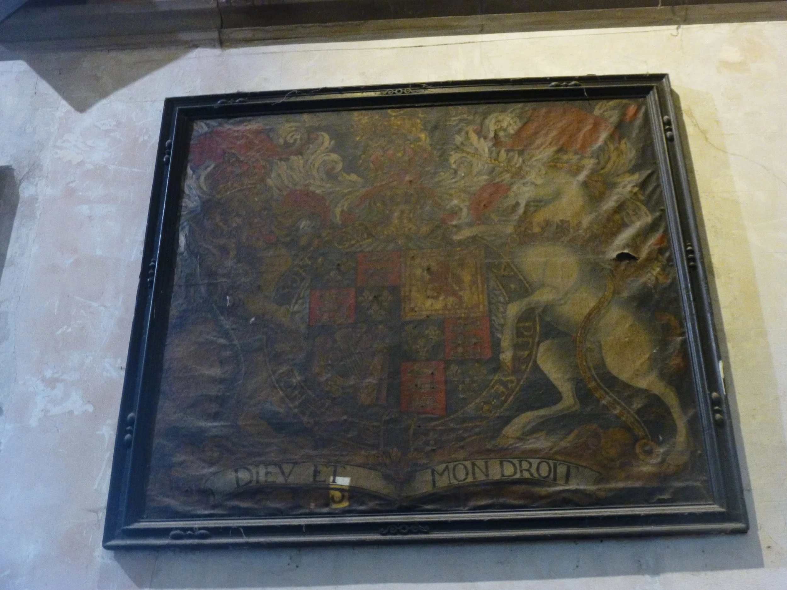 You can see from the picture below how dirty and sagging the canvas of the Coat of Arms has become. It has been in the church since the early 17th Century and as the church porch was added later, it is going to be a tight squeeze to get it out. The entire frame will be lifted from the wall, protection added and then it will go to the conservator’s workshop. We can’t wait to get it back fully restored.