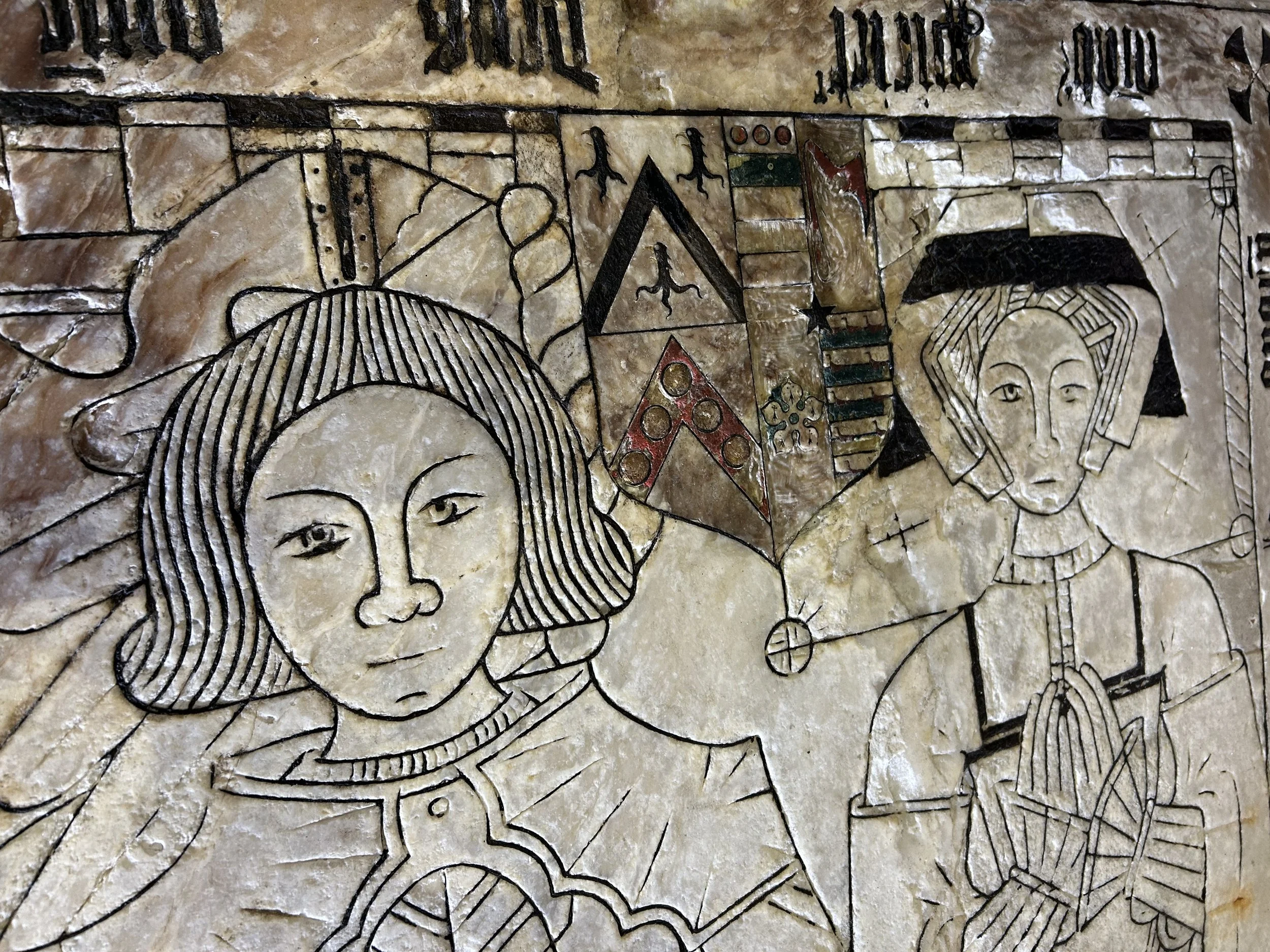 Newly cleaned alabaster tomb lid previously grey and with little detail. Early use of resins add colour to the heraldic shield.