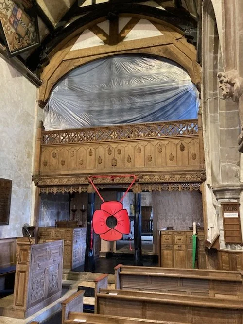 Our contractors are now on site and the chancel is very much out of bounds to the congregation as work starts on repairing the internal ceilings to remove years of damage by jackdaws who have pecked through the plaster as part of their nesting activity. The outer eaves were closed off earlier this year before the breeding season started and the jackdaws have retired to the roof in the south aisle where they can’t do any internal damage. We improvised for our Remembrance Service on 9th November with a huge poppy suspended on the screen to give us something to focus on other than the closed off space and we may use this approach again in future as it was a strong reminder of the purpose of the service.